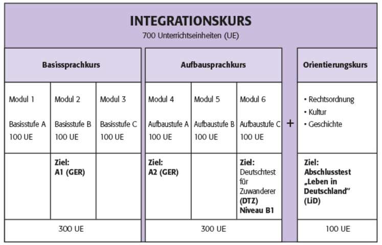 Der Integrationskurs umfasst einen Deutschkurs, in dem die Teilnehmenden an ausreichende Kenntnisse der deutschen Sprache herangeführt werden und einen Orientierungskurs, der zur Vermittlung von Kenntnissen der Rechtsordnung, der Kultur und der Geschichte in Deutschland dient. Der Integrationskurs umfasst insgesamt 700 Unterrichtsstunden. Davon entfallen 600 Stunden auf den Deutschkurs und 100 Stunden auf den Orientierungskurs. Der Deutschkurs ist in 6 Stufen gegliedert mit je 100 Unterrichtsstunden. Jede Stufe kann einzeln belegt werden.